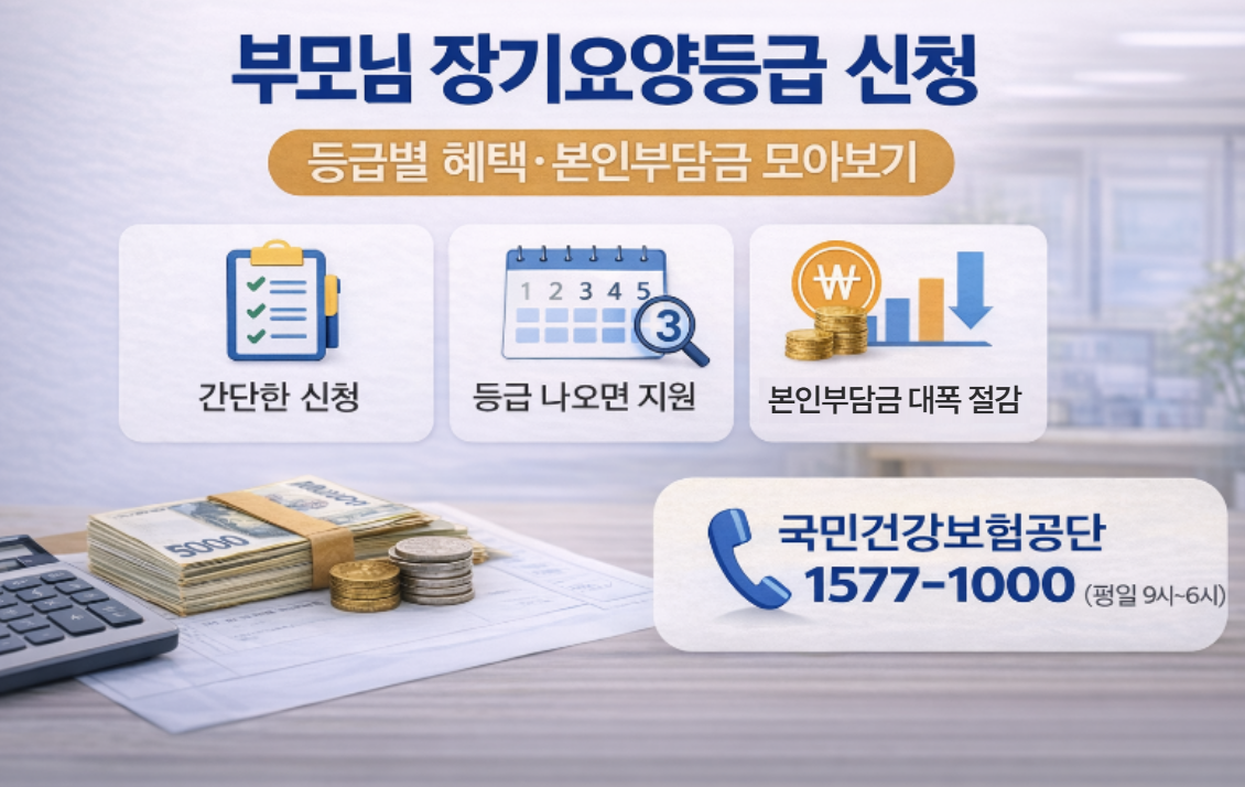 ※ 본 글은 노인장기요양보험 등급 신청 방법 및 등급별 혜택에 대한 정보 제공을 목적으로 작성된 콘텐츠입니다. 실제 등급 판정 및 본인부담금은 개인의 상태와 이용 서비스에 따라 달라질 수 있으며, 최종 확인은 국민건강보험공단 공식 안내 기준에 따릅니다.