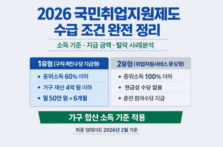 ※ 본 글은 2026년 고용노동부 국민취업지원제도 운영 지침을 바탕으로, 실제 행정 적용 구조를 이해하기 쉽게 정리한 해설 콘텐츠입니다. 특정 금융상품 또는 투자 유도를 목적으로 하지 않습니다.1. 국민취업지원제도, 단순 실업급여와 무엇이 다른가국민취업지원제도는 단순한 실업급여 제도가 아닙니다. 고용보험 가입 이력이 부족하거나, 실업급여 수급이 종료된 이후에도 취업이 어려운 구직자를 대상으로 일정 기간 소득을 지원하면서 체계적인 취업 상담·훈련을 병행하는 제도입니다.많은 분이 “무직이면 받을 수 있다”라고 생각하지만, 실제 심사는 소득·재산·가구 구성 등을 종합적으로 판단합니다. 따라서 단순히 직장이 없다는 이유만으로 자동 수급 대상이 되는 구조가 아니며, 최근에는 가구원 합산 소득에 대한 확인 절차가 ..
