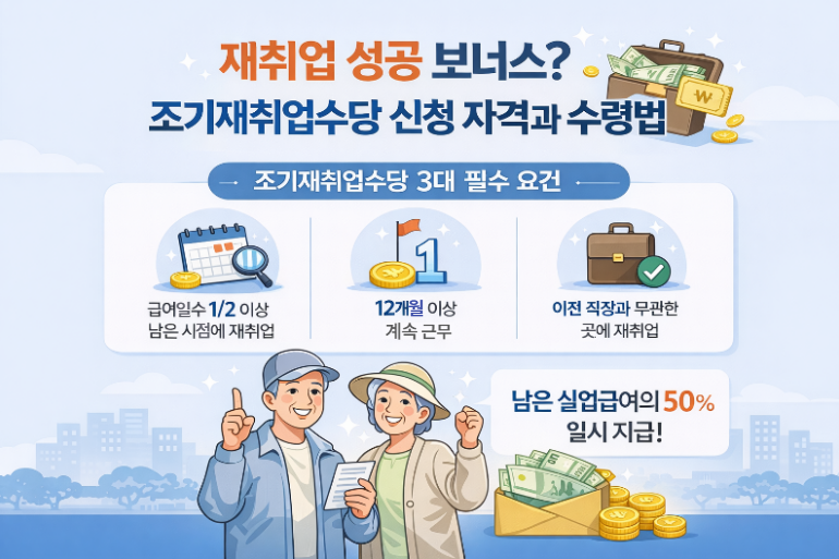 ※ 본 글은 고용보험법에 근거한 조기 재취업수당 제도의 일반적인 정보를 제공하기 위해 작성되었습니다. 개인의 소득, 고용보험 가입 이력, 재취업 형태 및 지역 고용센터의 판단에 따라 실제 수급 가능 여부와 금액은 달라질 수 있습니다. 반드시 고용 24 홈페이지 또는 관할 고용센터를 통해 본인의 정확한 수급 자격을 확인하시기 바랍니다.1. 재취업의 기쁨을 배가시키는 조기 재취업수당이란?실업급여를 수급하던 중 예상보다 빨리 새로운 직장을 찾게 되면, 일부 수급자들 사이에서는 남은 실업급여를 받지 못해 오히려 경제적으로 손해라는 오해가 생기곤 합니다. 하지만 정부는 5060 세대를 포함한 구직자들의 빠른 현장 복귀를 장려하고 실업 기간을 단축하기 위해 '조기 재취업수당'이라는 강력한 인센티브 제도를 운영하고 ..