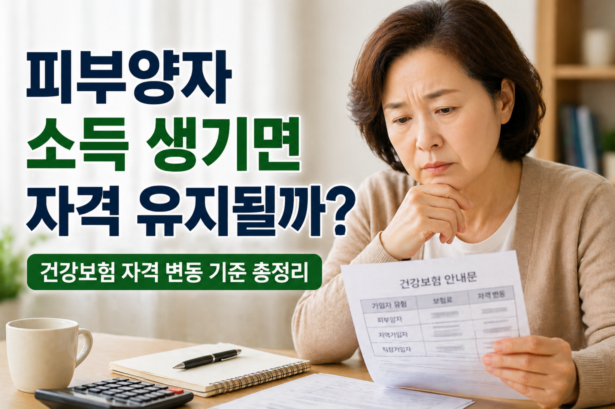 ※ 본 원고는 대한민국 건강보험 제도의 구조적 이해를 돕기 위한 정보 제공을 목적으로 작성되었습니다. 실제 건강보험료 부과 점수, 산정 방식 및 가입자 자격 변동 여부는 개인의 소득 수준, 재산 보유 현황, 가구 조건 및 국민건강보험공단의 세부 산정 기준에 따라 달라질 수 있습니다. 정확한 본인의 보험료 및 자격 상태는 반드시 국민건강보험공단 홈페이지 또는 고객센터를 통해 최종 확인하시기 바랍니다.건강보험 피부양자로 등록되어 보험료 부담 없이 보장을 받던 중, 소액이라도 소득이 발생하게 되면 자격 유지 여부에 대해 큰 불안감을 느끼게 됩니다. 흔히 피부양자로 등록된 이후 소득이 조금이라도 생기면 자격이 바로 사라진다고 생각하기 쉽습니다. 하지만 실제로는 소득의 종류와 규모에 따라 다르게 적용됩니다. 건강..